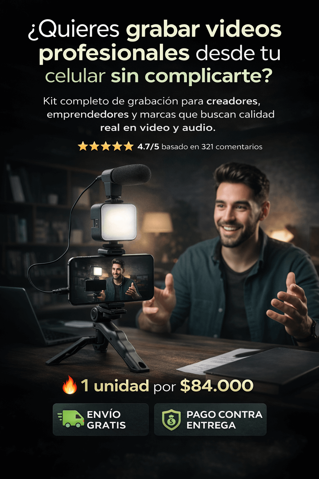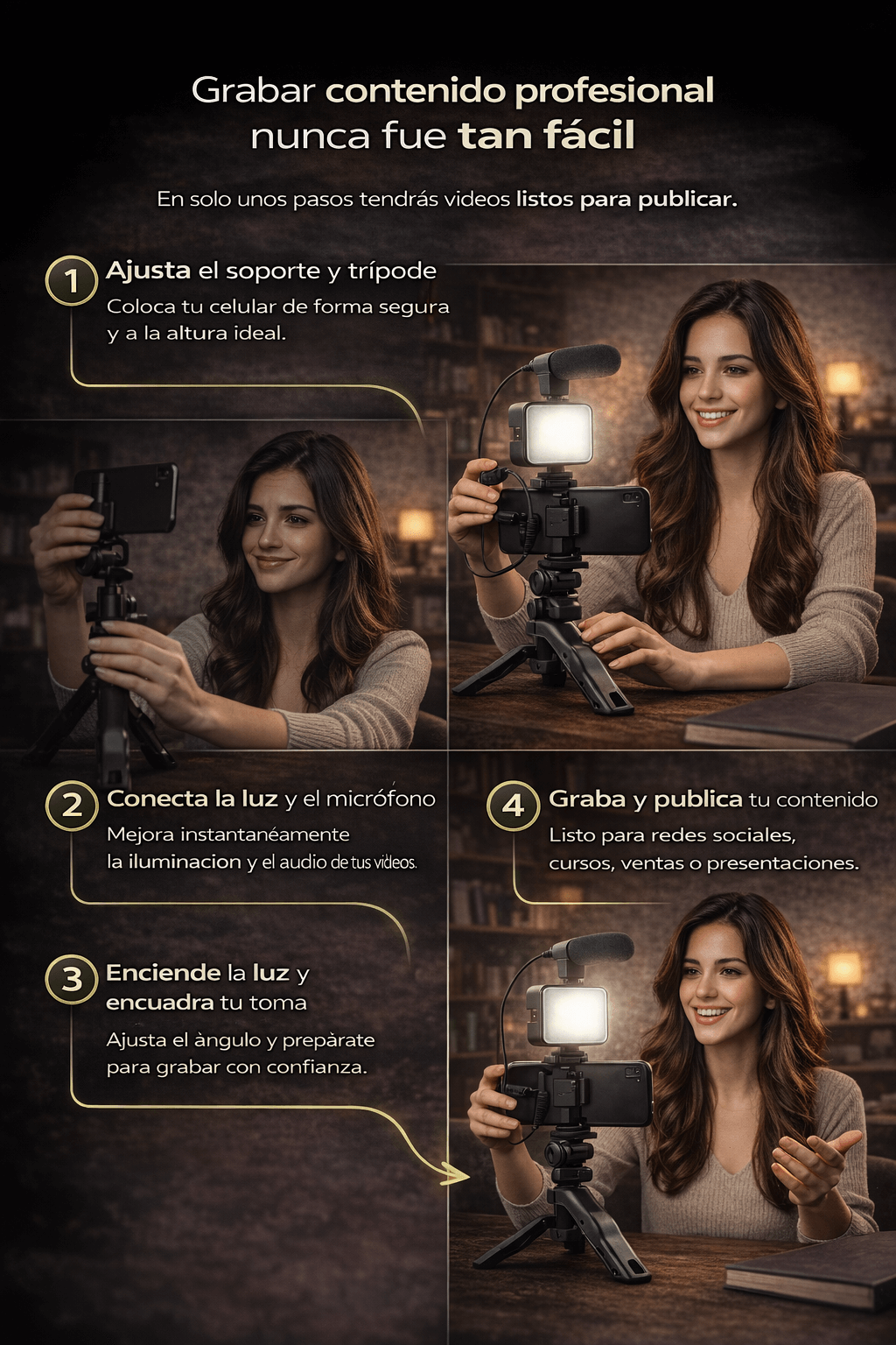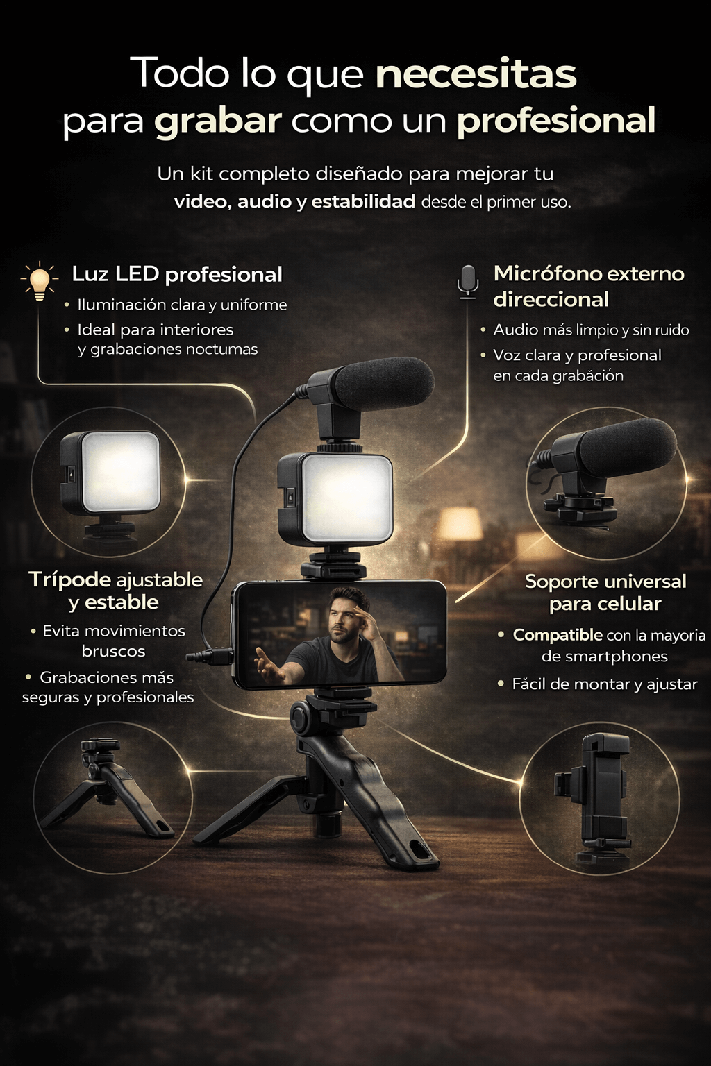 Sí. El kit incluye trípode, soporte para celular, luz LED y micrófono.