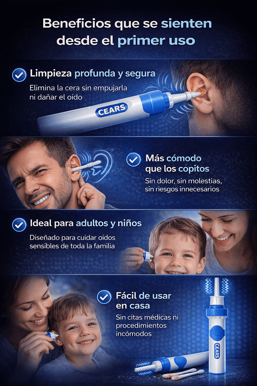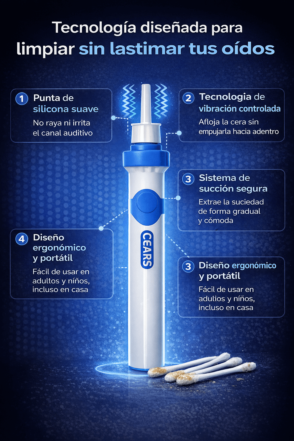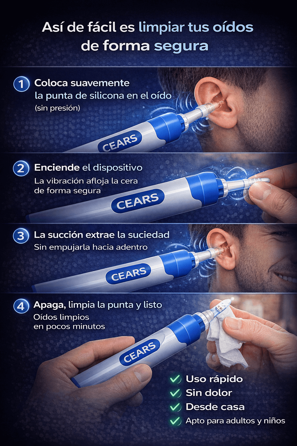 Sí. Está diseñado con una punta suave de silicona y un sistema de vibración + succión controlada, lo que permite limpiar sin dañar el oído ni empujar la cera hacia adentro.